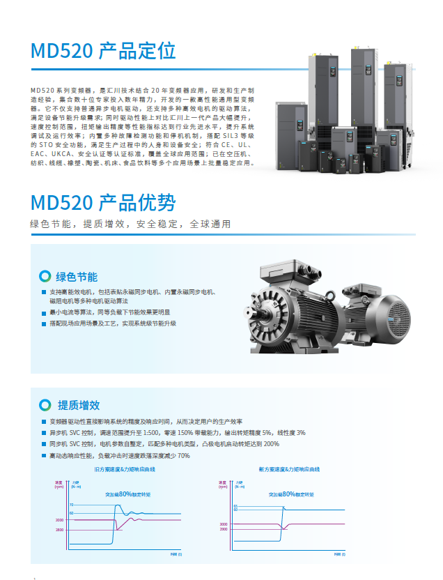 較上代變頻器性能全面升級,0HZ最大150%出力,開環矢量調速范圍可達1:500,助力用戶高質量、高效率的生產